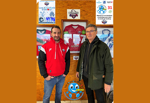 Mathieu DAVASSE, Président du club DEUX RIVES RUGBY partenaire pour la collecte des bouchons d’amour, a reçu le Président Guy MARQUILLE lors d’un match au stade de Roques (31). Un grand merci à L’Oréal Minondo qui est à l’origine de ce partenariat.